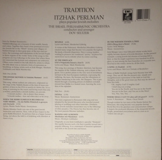 Itzhak Perlman - Israel Philharmonic Orchestra - Dov Seltzer – Tradition - Itzhak Perlman Plays Popular Jewish Melodies-folk -1967 (Mint Vinyl)