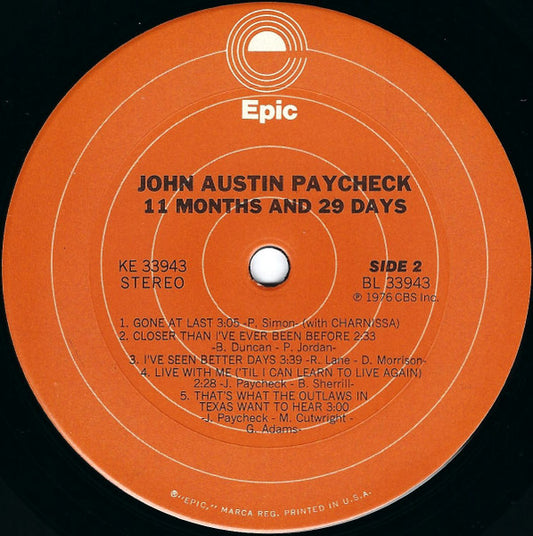 John Austin Paycheck 11 Months And 29 Days - 1976- Folk, World, & Country Country, Honky Tonk (Vinyl)