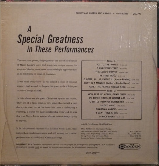 Mario Lanza – Christmas Hymns And Carols Pop, Classical Style: Vocal, Holiday (VINYL)