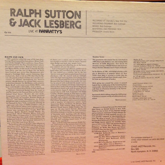 Ralph Sutton & Jack Lesberg – Live at Hanratty’s (Traditional Jazz / Piano–Bass Duet / Live Recording, Vinyl LP) CJ‑111