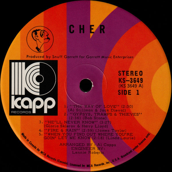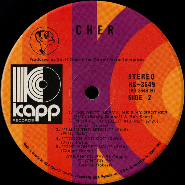 This Canadian Kapp pressing is notably scarce compared to its U.S. counterpart, making it a worthwhile addition for Cher completists and those interested in early 70s transitional pop. The pressing quality on these Canadian Kapp releases was generally excellent, and this album benefits from the label's attention to detail during this period. While the album didn't achieve significant commercial success at the time, it's gained appreciation among collectors for its eclectic song selection and Cher's confident vocal performances. For anyone documenting the evolution of one of pop music's most enduring figures, this represents an essential bridge between her 60s folk-rock phase and her later transformation into a solo superstar.