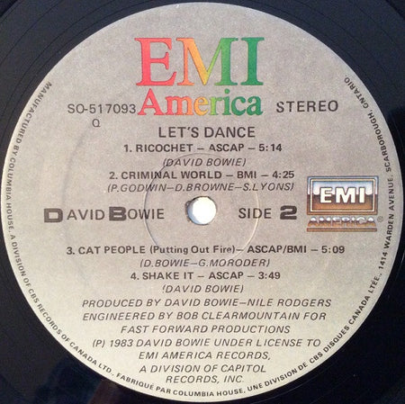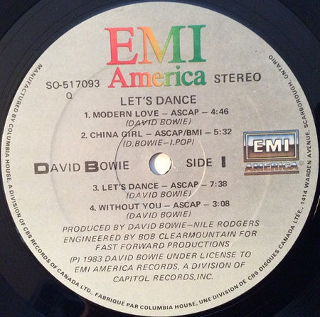 Here's a Canadian EMI America pressing of Bowie's commercial breakthrough "Let's Dance" – the album that introduced the Thin White Duke to MTV and stadium audiences worldwide. Released at the height of the new wave era, this record marked Bowie's collaboration with producer Nile Rodgers, who brought his Chic-honed disco sensibilities to craft what would become Bowie's biggest-selling album. The pairing seemed unlikely on paper, but Rodgers' sleek production perfectly complemented Bowie's theatrical pop instincts, resulting in three massive singles and a sound that defined early 80s sophistication.