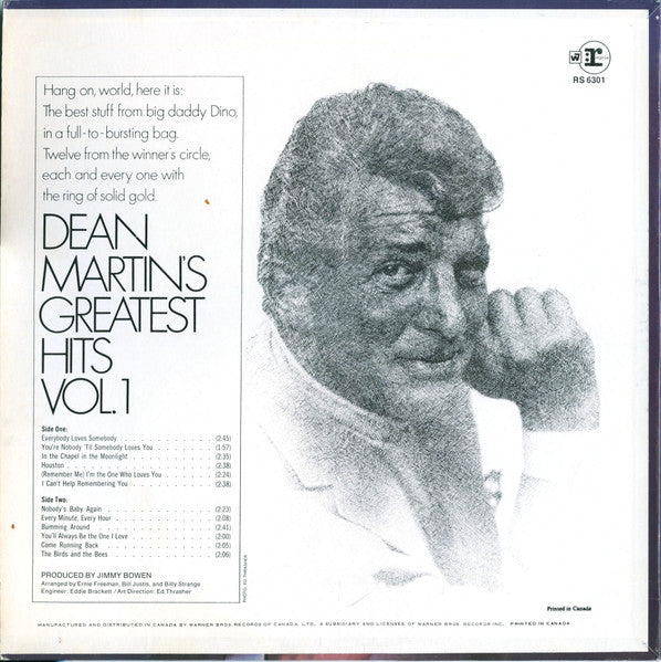 Here's a Canadian pressing of Dean Martin's first greatest hits collection from Reprise, capturing Dino at the peak of his solo career after leaving Capitol Records. This 1968 compilation pulls together his biggest Reprise singles from the mid-60s, including "Everybody Loves Somebody," the surprise #1 hit that briefly knocked The Beatles off the charts in 1964, plus "The Door is Still Open to My Heart" and "I Will." What makes this period particularly fascinating is how Martin was simultaneously dominating multiple entertainment mediums – his variety show was crushing the ratings, the Rat Pack was at their cultural zenith, and these recordings showcase his effortlessly cool vocal style that defined American sophistication.