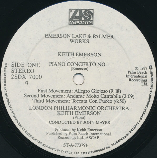 Works (Volume 1) is one of ELP’s most ambitious releases, issued in 1977 as a double‑LP showcasing each member’s individual musical identity before reuniting on Side Four. The Canadian pressing, manufactured and distributed by WEA Music of Canada, carries the 2SDX‑7000 catalog number and the standard Atlantic palm‑tree labels of the era.