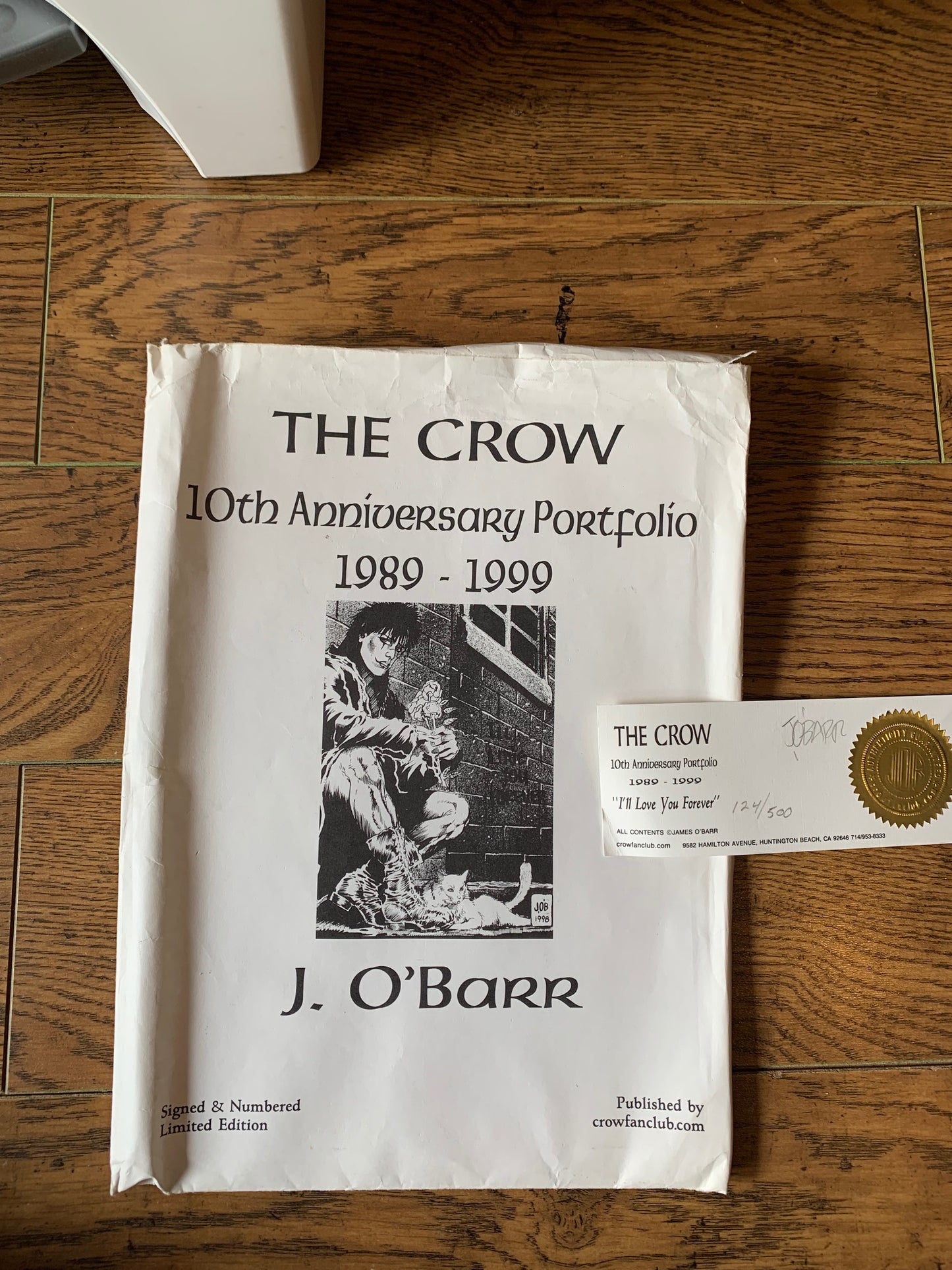 This is the vintage 1999 "I'll Love You Forever" art portfolio celebrating the 10th anniversary (1989 - 1999) of James O'Barr's classic comic book series The Crow, Includes original envelope, 5 original art prints, original certificate of authenticity signed by O'Barr, that was included when ordered. The 5 prints are new artwork of O'Barr's classic character drawn between 1997 and 1998. The Crow was adapted into the hit 1994 film of the same name, which was also Brandon Lee's final role. Outer envelope shows some storage wear. Prints & contents are VG+ Slight creasing from storage , can be flattened better.. From a non-smoking home.Please take a look at the pictures to judge condition for yourself.