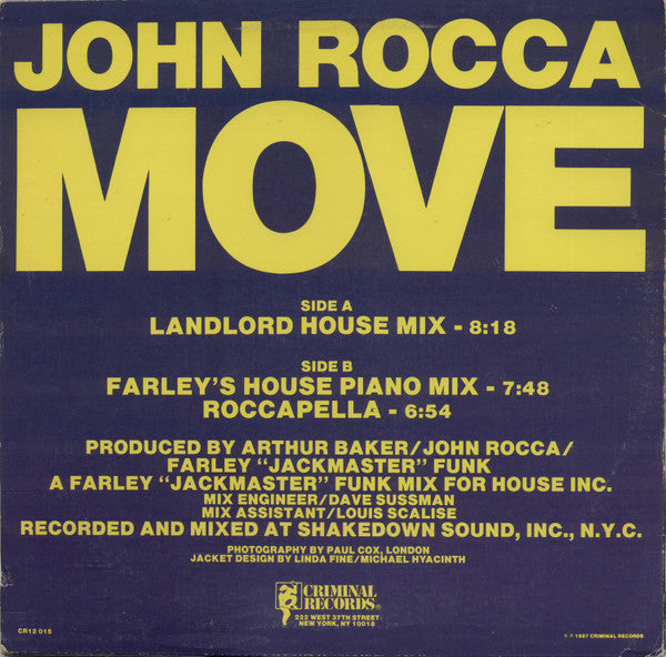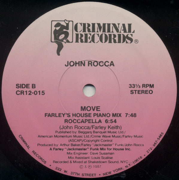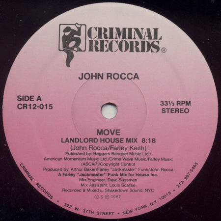 John Rocca's "Move" is a 1987 electronic/house album that showcases the British producer's transition into the emerging house music scene. Released on Criminal Records, the album blends synthesizer-driven dance tracks with Rocca's distinctive production style that helped bridge early 80s electro-funk with the developing house sound. The title track "Move" became a notable dancefloor favorite, demonstrating Rocca's ability to craft infectious rhythms that captured the energy of late 80s club culture.