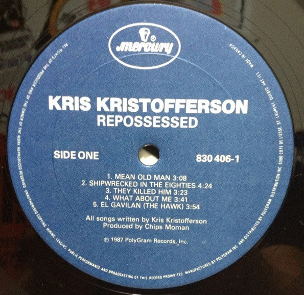 Description This Canadian Mercury stereo pressing (830 406‑1) captures Kris Kristofferson in a reflective, politically charged late‑’80s period, backed by The Borderlords and produced by Chips Moman. With songs like “Shipwrecked in the Eighties,” “They Killed Him,” and “This Old Road,” the album blends Kristofferson’s gravel‑toned storytelling with lean, roots‑country arrangements. Recorded with a tight studio band and presented here in its Canadian PolyGram issue, Repossessed stands as a strong entry in Kristofferson’s mature catalog—raw, direct, and unmistakably his voice.