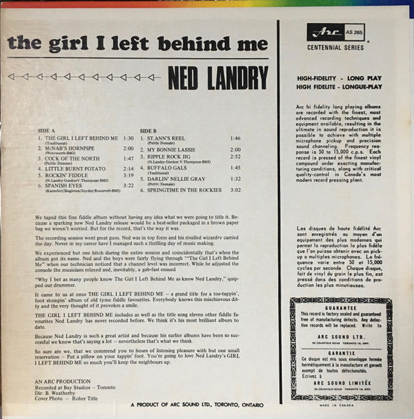 Ned Landry – The Girl I Left Behind Me - Folk, World, & Country-1967 Fiddle, Maritimes, (vinyl)in great shape Near Mint - #225