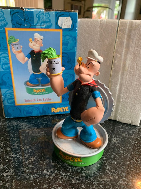 I have a very hard to find Popeye Bobber Spinach Can It is in new condition with no damage. Popeye swings back and forth at his waist when moved and the lid behind him also swings in different directions. It has the King Features Syndicate Inc. printed on the bottom. Popeye measures about 6 inches tall.