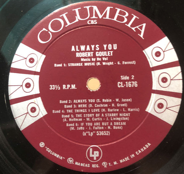 Canadian mono pressing of Always You, the 1963 vocal LP from Robert Goulet, arranged and conducted by Frank De Vol. A lush, romantic collection of orchestral ballads and standards, featuring compositions by Wright & Forrest, Van Heusen, Genaro, Sigman, and others. Maroon Columbia label with white text. Catalog # CL‑1676. Also issued in stereo as CS‑8478.