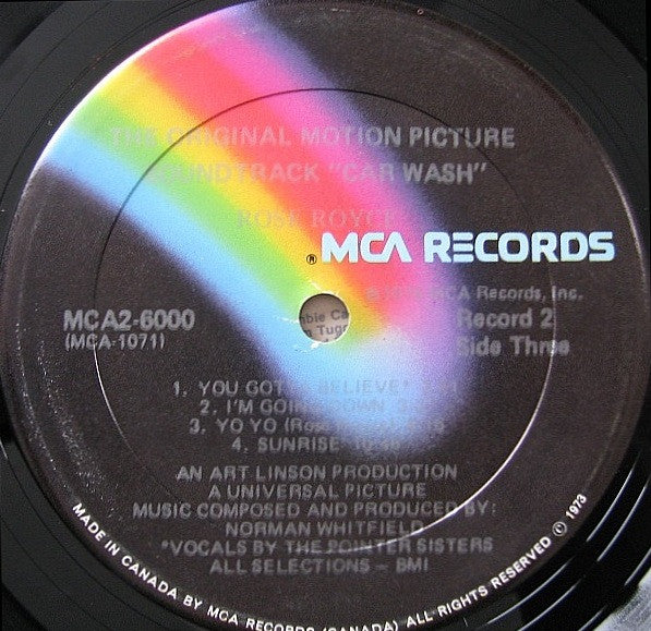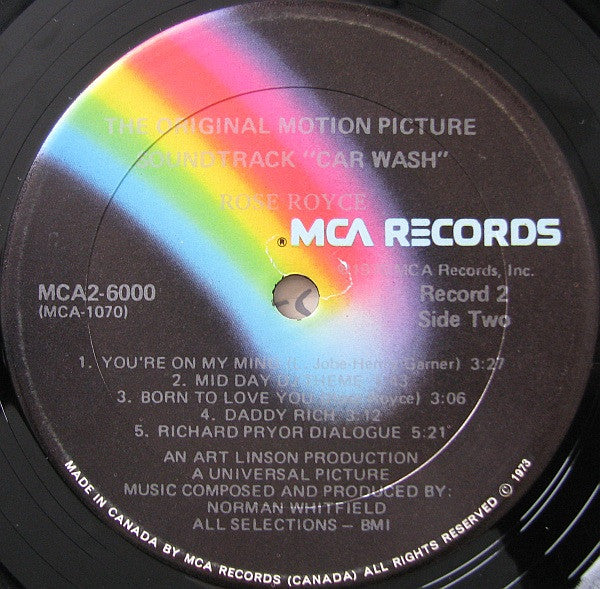Cover Notes A vibrant double LP soundtrack from the cult classic film Car Wash, blending funk, soul, and disco with comedic interludes. This Canadian pressing features the iconic pyramid-style title art and full MCA rainbow labels.