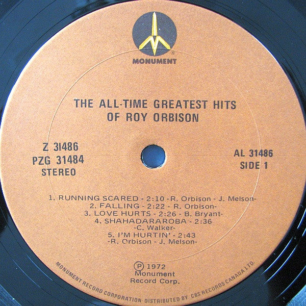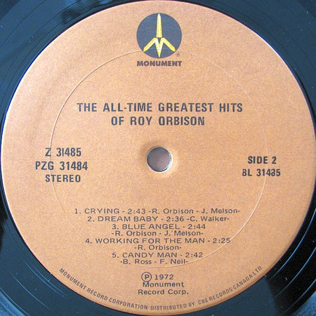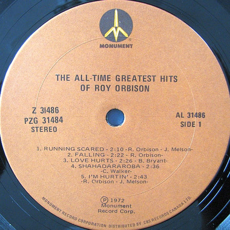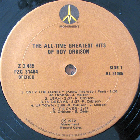 This Canadian Monument pressing of Roy Orbison's "All-time Greatest Hits" captures the Big O at his absolute peak, gathering together the soaring ballads and driving rockers that made him one of the most distinctive voices of the early rock era. Monument Records was Orbison's creative home during his golden period from 1960-1965, where he crafted those impossibly dramatic three-octave performances under the guidance of producer Fred Foster. This compilation likely draws from that legendary run that produced "Only the Lonely," "Crying," "In Dreams," and "Oh, Pretty Woman" – songs that showcased Orbison's unique ability to blend operatic vulnerability with rock and roll swagger.