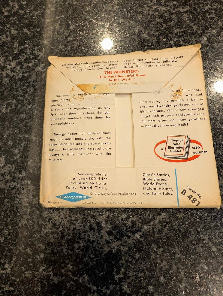 The Munsters in "The Most Beautiful Ghoul in the World" Herman, Lily, Eddie, Grandpa, Marilyn, "Spot" Cast: Yvonne DeCarlo, Fred Gwynne, Butch Patrick, Al Lewis Pat Priest 1960s TV Show Sitcom Gothic Campy Ghoulish Fun! Not-So-Horrifying Horror! view-master 3 Reels Flat & smooth, nice booklet and packet its quite rare - $250 firm cash Check out the large collection being listed