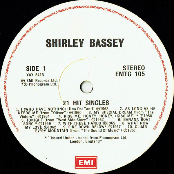 Shirley Bassey 21 Hit Singles- Blues, Pop, Stage & Screen ,Vocal ( UK Import vinyl)