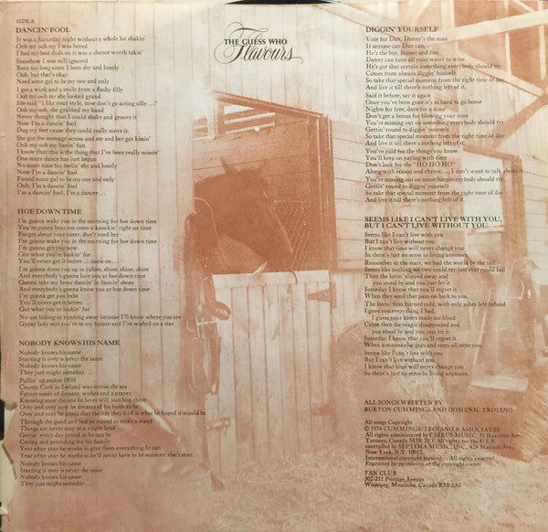 Here's a piece of Canadian rock history that often gets overlooked in The Guess Who's catalog, but shouldn't be. "Flavours" represents the band in transition after Burton Cummings and Randy Bachman's creative partnership had ended, with Bachman departing to form Bachman-Turner Overdrive. This 1974 release showcased Cummings stepping fully into his role as the band's primary creative force, backed by the solid rhythm section of Garry Peterson and Bill Wallace, plus newcomer Domenic Troiano on guitar. The album captures a grittier, bluesier direction for the group, moving away from some of their earlier pop sensibilities while maintaining those distinctive prairie rock roots that made them Canada's biggest international export of the era.
