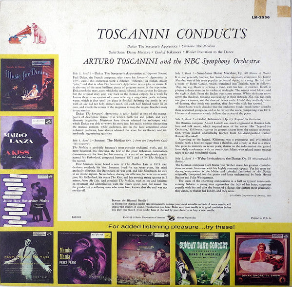 Toscanini Conducts is a vintage RCA Victor Red Seal release featuring legendary conductor Arturo Toscanini leading the NBC Symphony Orchestra through a selection of dramatic and evocative orchestral works. This U.S. mono pressing, catalog number LM-2056, includes iconic pieces such as Dukas’ “The Sorcerer’s Apprentice,” Smetana’s “The Moldau,” and Saint-Saëns’ “Danse Macabre.” The album showcases Toscanini’s precision and intensity, bringing out the vivid storytelling and dynamic contrasts in each composition. With arrangements by Berlioz and performances steeped in historical gravitas, this release remains a collector-grade document of mid-century orchestral excellence.