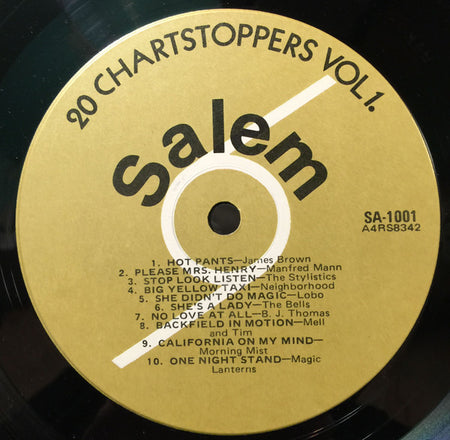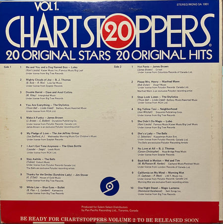 Here's a fascinating slice of mid-70s Canadian compilation history that serious collectors often overlook. Salem Records' "20 Chartstoppers Vol 1." represents the golden era of budget compilation albums, when independent labels would license hit tracks and repackage them for the mass market. Salem Records was a Montreal-based operation that specialized in these multi-genre collections, and this particular volume captures the eclectic radio landscape of 1974 perfectly. The breadth here is remarkable – you're getting everything from the emerging reggae sounds that were just breaking into North American consciousness to the funk and soul tracks that were dominating dance floors, all wrapped up with the soft rock and pop rock that defined FM radio of the era.